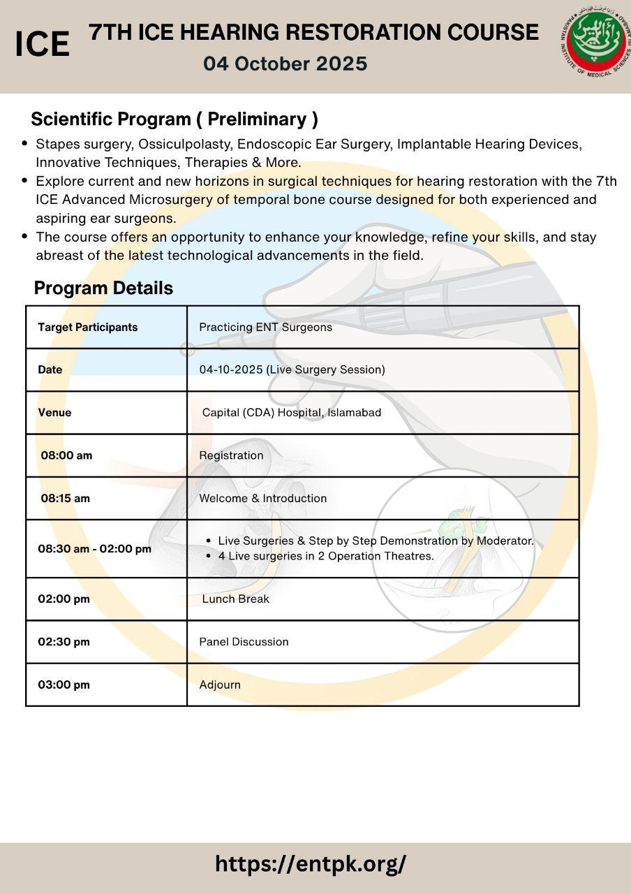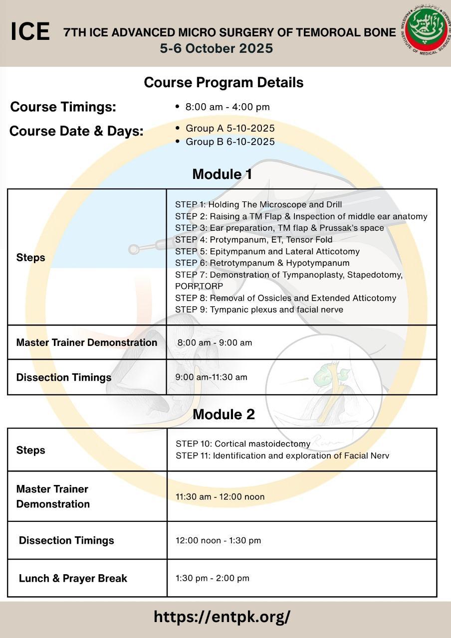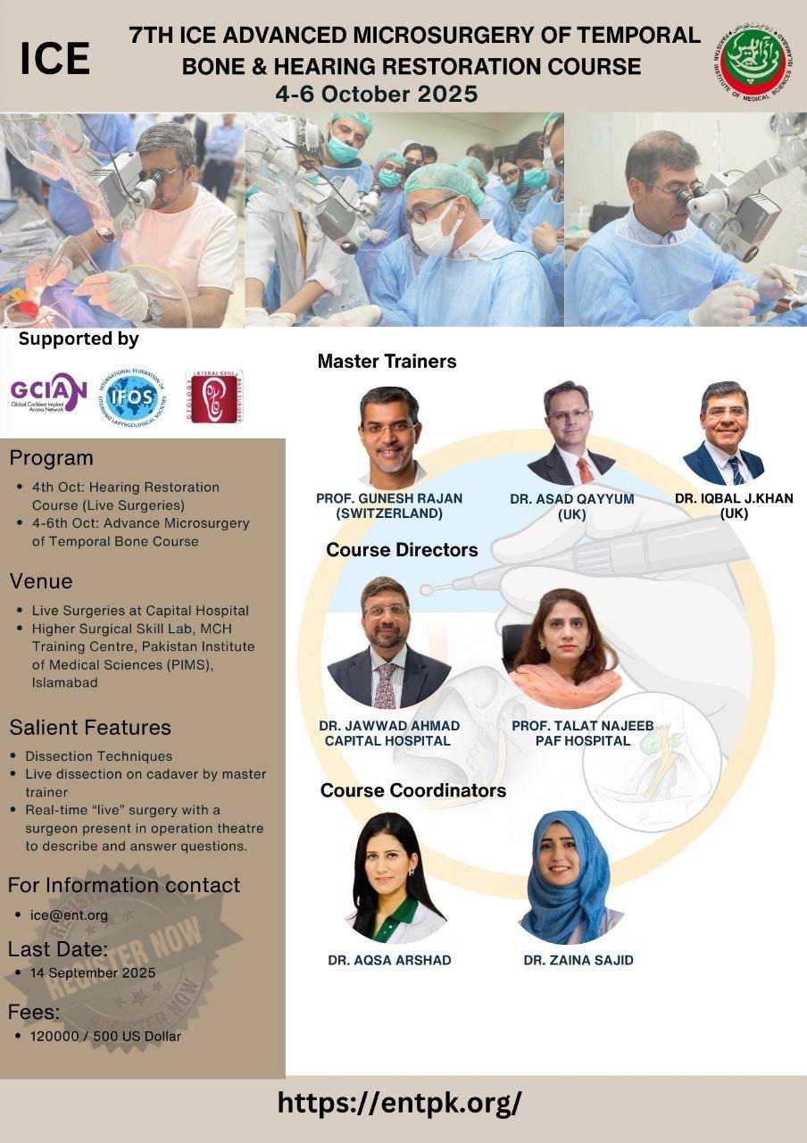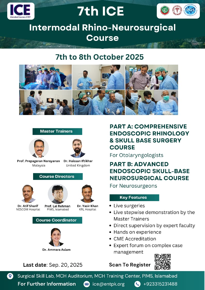 We welcome all of you to join us at The 7th Islamabad ENT cadaveric dissection course. We are excited to hold a face-to-face meeting again and share our time and knowledge with all friends all over country and we will do it safe. Hands on Cadaver dissections are historically known to be the best method for medical professionals to practice surgical techniques, share new knowledge, and set new operative guidelines. On the other hand, important advantage has been found regarding the social interaction between professionals arriving from different backgrounds. If you have any questions about the site, email: ice@entpk.org
