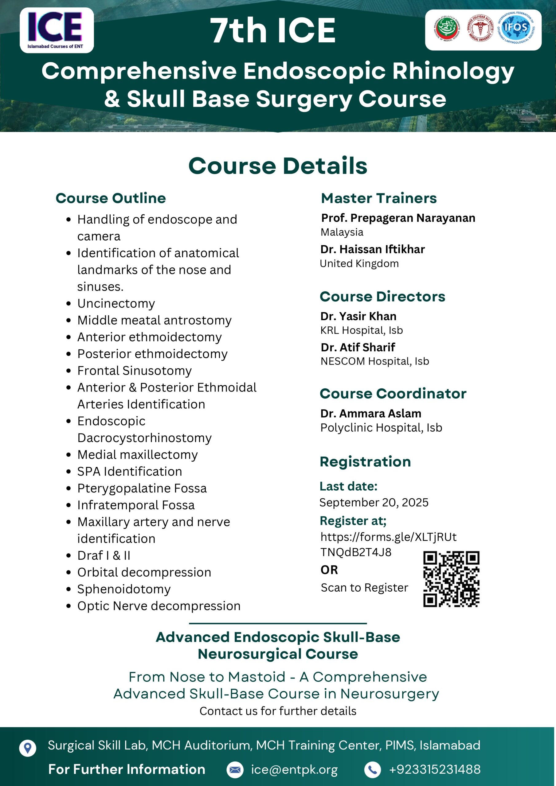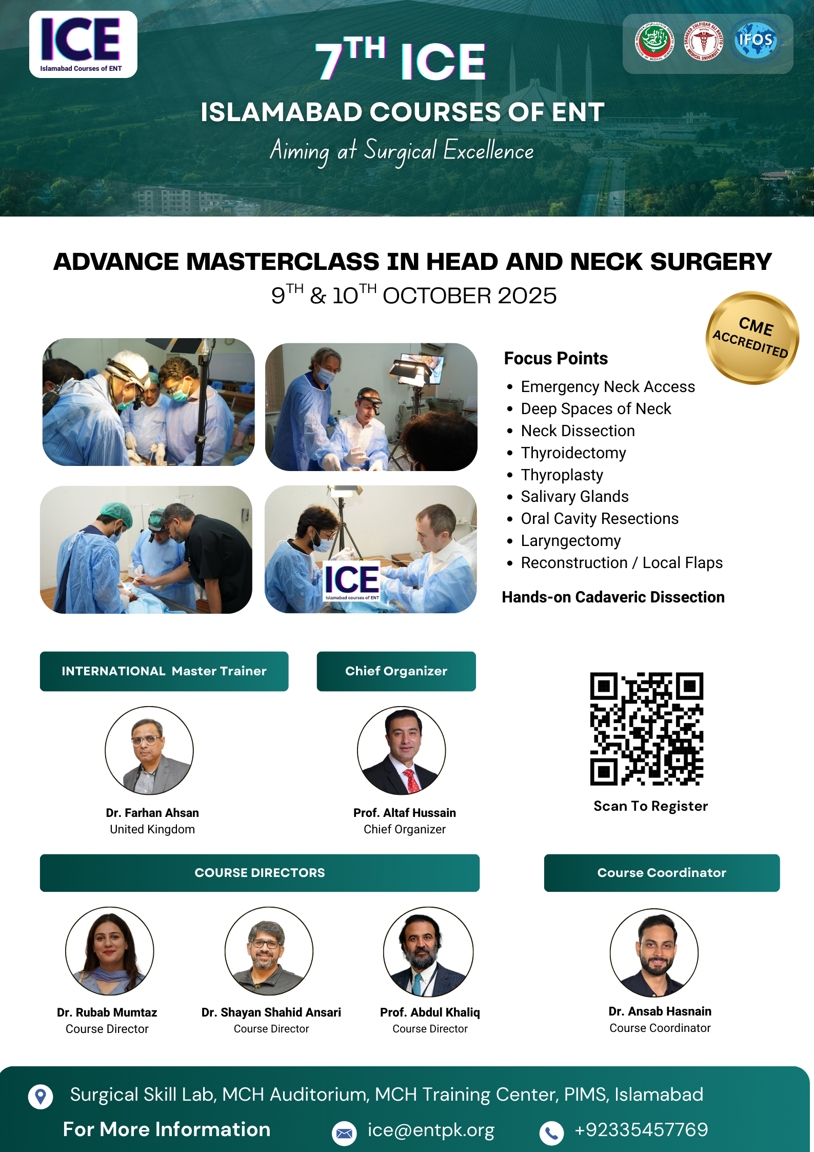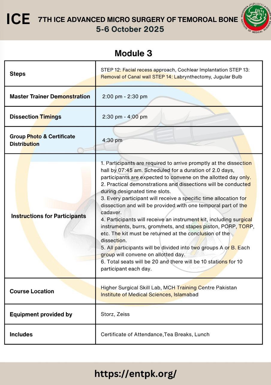 We welcome all of you to join us at The 7th Islamabad ENT cadaveric dissection course. We are excited to hold a face-to-face meeting again and share our time and knowledge with all friends all over country and we will do it safe. Hands on Cadaver dissections are historically known to be the best method for medical professionals to practice surgical techniques, share new knowledge, and set new operative guidelines. On the other hand, important advantage has been found regarding the social interaction between professionals arriving from different backgrounds. If you have any questions about the site, email: ice@entpk.org