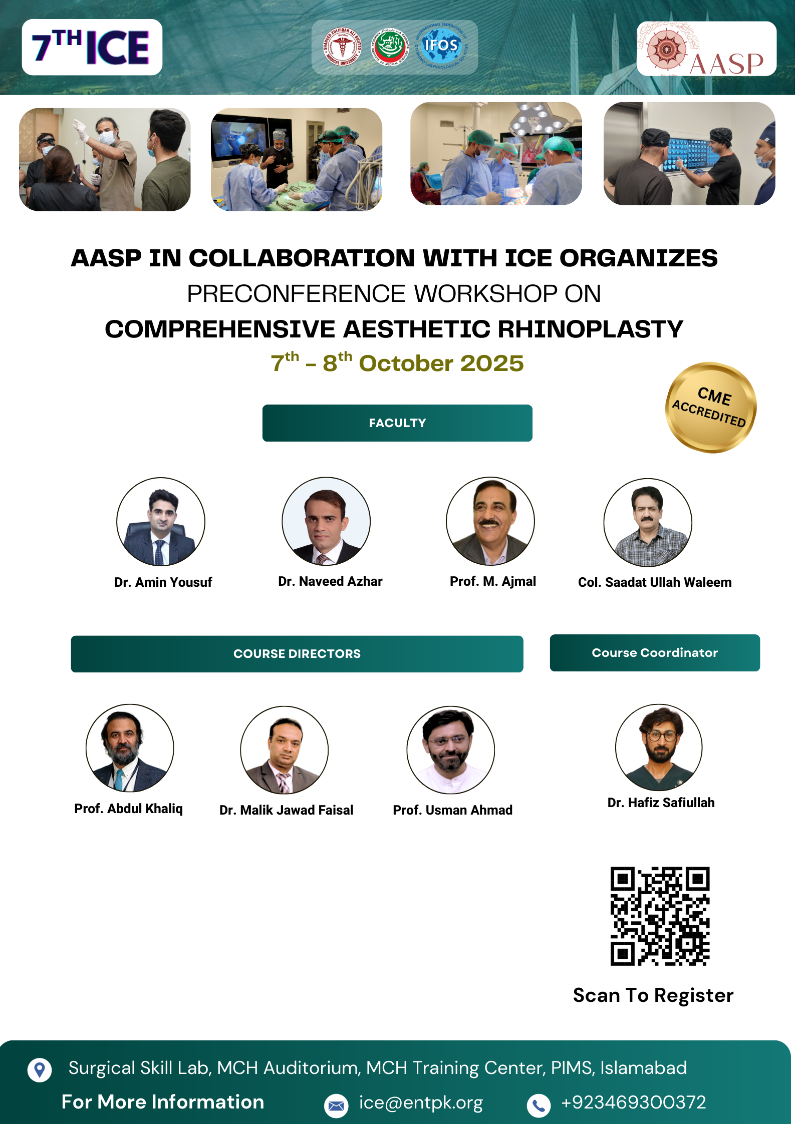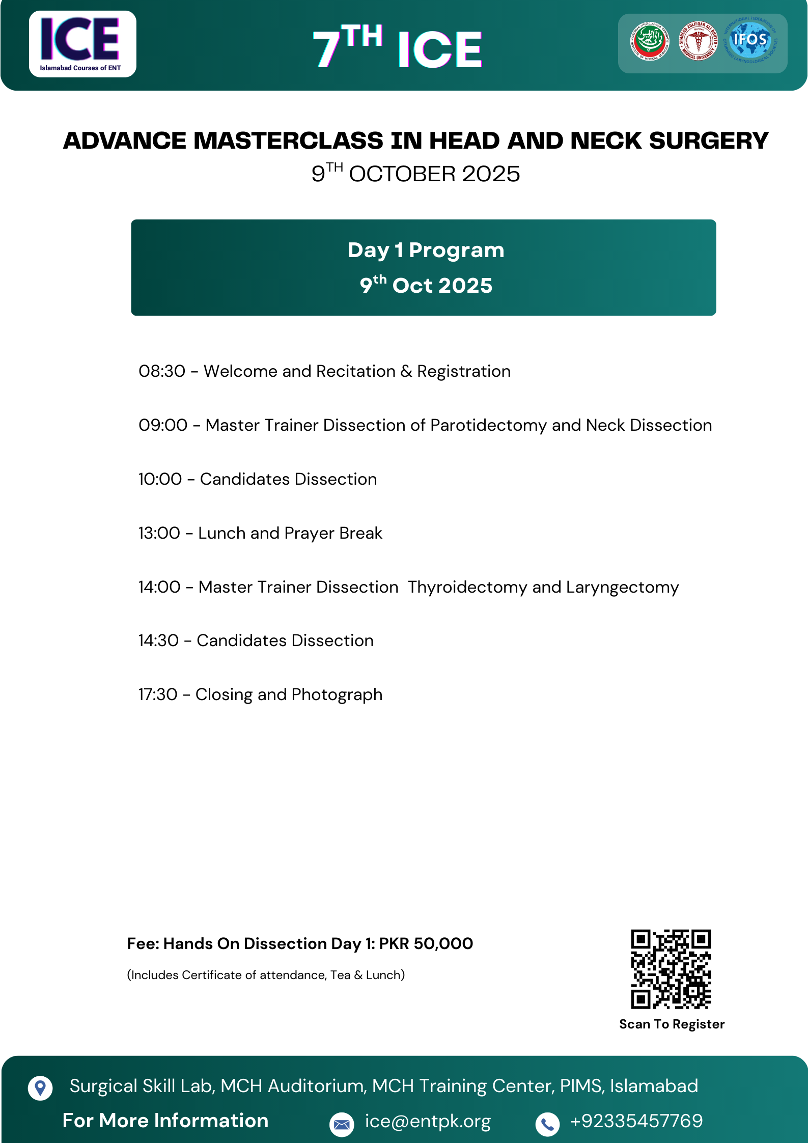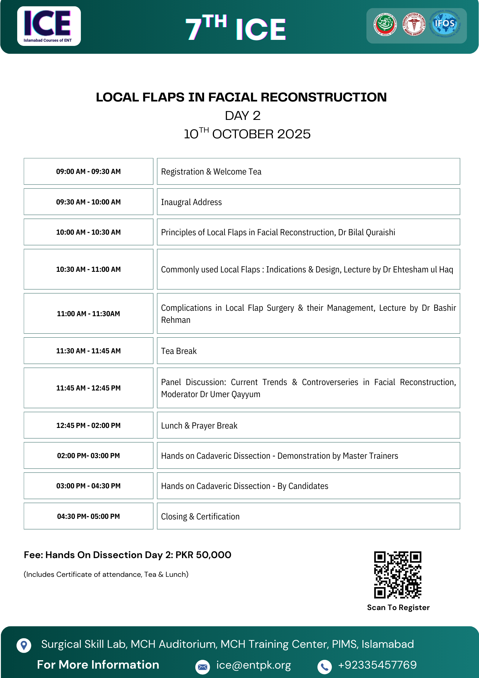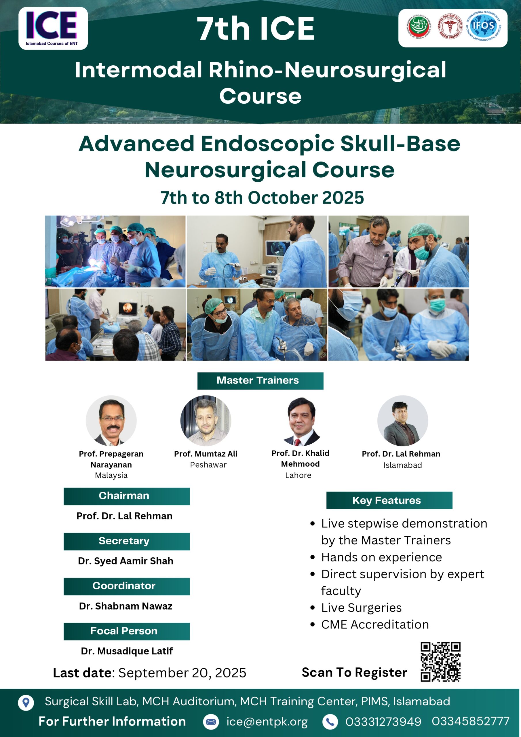 We welcome all of you to join us at The 7th Islamabad ENT cadaveric dissection course. We are excited to hold a face-to-face meeting again and share our time and knowledge with all friends all over country and we will do it safe. Hands on Cadaver dissections are historically known to be the best method for medical professionals to practice surgical techniques, share new knowledge, and set new operative guidelines. On the other hand, important advantage has been found regarding the social interaction between professionals arriving from different backgrounds. If you have any questions about the site, email: ice@entpk.org